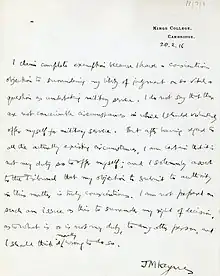 - (en) « First World War: Keynes’ Conscientious Objection », King's College, .
