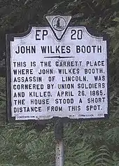 Un détachement de vingt-cinq soldats de l'Union, du 16e régiment de cavalerie de New York, commandés par le lieutenant Edward P. Doherty (en) et accompagnés par le détective Everton Conger (en), poursuivirent Booth dans le Sud du Maryland et à travers les rivières Potomac et Rappahannock jusqu'à la ferme de Richard Garrett, juste au sud de Port Royal, en Virginie. Booth et son compagnon, David Herold, avaient été menés à la ferme par William S. Jett, ancien soldat du 9e de cavalerie de Virginie Cavalry, qu'ils avaient rencontré avant de traverser le Rappahannock[20].