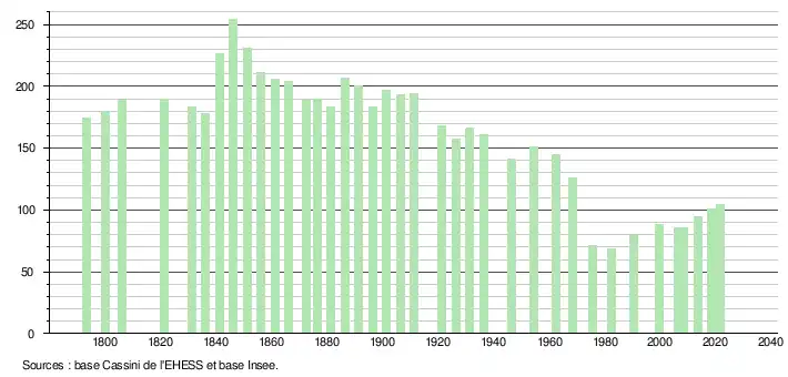 L'évolution du nombre d'habitants est connue à travers les recensements de la population effectués dans la commune depuis 1793. Pour les communes de moins de 10 000 habitants, une enquête de recensement portant sur toute la population est réalisée tous les cinq ans, les populations légales des années intermédiaires étant quant à elles estimées par interpolation ou extrapolation[18]. Pour la commune, le premier recensement exhaustif entrant dans le cadre du nouveau dispositif a été réalisé en 2008[19].