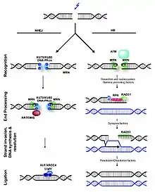 - Recrutement d'autres protéines impliquées dans la réparation : Une protéine-kinase ADN dépendante (DNA-PK), une ADN ligase spécifique, une terminal-transférase.