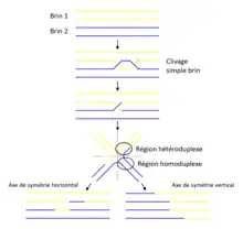 Dans une jonction de Holliday, deux duplex homologues sont liés via un échange de nucléotides entre deux brins d’ADN doubles brins. La jonction implique donc la présence de 4 brins d’ADN. La formation de la jonction de Holliday commence par la formation d’une boucle D d’ADN dans laquelle un brin d’un duplex envahit le deuxième duplex. Ceci crée des régions hétéroduplexes d’ADN, c’est-à-dire des régions où l’ADN des deux brins est complémentaire. Le clivage de la boucle D suivi par une ligation crée la jonction de Holliday. Les duplex ainsi liés vont ensuite adopter une forme planaire à la suite d'interactions avec des protéines recombinases. À ce stade, on observe deux régions homoduplexes et deux régions hétéroduplexes créant ainsi deux axes de symétries, un axe vertical et un axe horizontal. Une protéine recombinase est alors en mesure de cliver les brins selon ces axes de symétrie. Dépendamment de l’axe qui est clivé, les produits vont varier. Si le clivage s’effectue selon l’axe horizontal, les deux brins filles vont différer des brins parentaux seulement d’une partie de leur séquence, un échange génétique entre les régions homologues va s’être effectué entre les brins parentaux. On obtient un produit sans recombinaison génétique, c’est-à-dire que les brins parentaux sont encore liés ensemble. Cependant, si le clivage s’effectue selon l’axe vertical, il va y avoir un enjambement entre les chromatides. On obtient un produit avec recombinaison génétique où les brins parentaux ont été échangés.