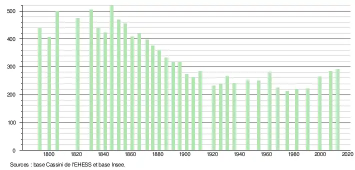 L'évolution du nombre d'habitants est connue à travers les recensements de la population effectués dans la commune depuis 1793. À partir du , les populations légales des communes sont publiées annuellement dans le cadre d'un recensement qui repose désormais sur une collecte d'information annuelle, concernant successivement tous les territoires communaux au cours d'une période de cinq ans. Pour les communes de moins de 10 000 habitants, une enquête de recensement portant sur toute la population est réalisée tous les cinq ans, les populations légales des années intermédiaires étant quant à elles estimées par interpolation ou extrapolation[22]. Pour la commune, le premier recensement exhaustif entrant dans le cadre du nouveau dispositif a été réalisé en 2007[23],[Note 1].