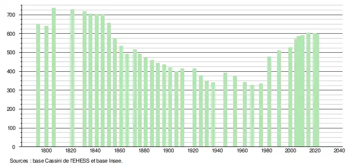 L'évolution du nombre d'habitants est connue à travers les recensements de la population effectués dans la commune depuis 1793. Pour les communes de moins de 10 000 habitants, une enquête de recensement portant sur toute la population est réalisée tous les cinq ans, les populations légales des années intermédiaires étant quant à elles estimées par interpolation ou extrapolation[32]. Pour la commune, le premier recensement exhaustif entrant dans le cadre du nouveau dispositif a été réalisé en 2004[33].