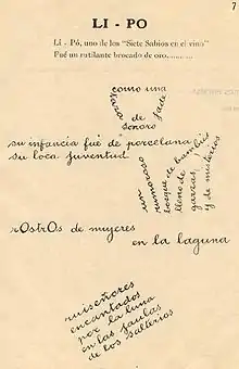 Dans le recueil de poèmes Li-Po y otros poemas (1920) — Li-Po étant le nom en espagnol du poète chinois Li Bo (701-762) —, Tablada joue avec le dessin et les mots pour honorer Li Bo qui, selon la légende, est mort dans un lac en essayant d'attraper la lune qui se reflétait dans ses eaux. Les poèmes peignent une vision amicale et quelque peu provocante de la réalité, avec l'intention de faire revivre l'esthétique de la nature à travers les calligrammes.