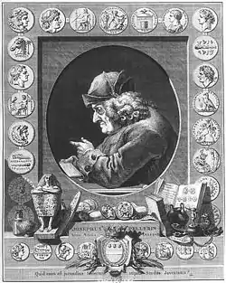 Devenu progressivement aveugle les quarante dernières années de sa vie, il avait écrit son œuvre colossale numismatique sur un ruban mince de papier qu'il déroule d'une bobine tout en identifiant les pièces qu'il traitait par la touche seul. Le portrait à droite en bas sur cette page provient de l'un des volumes de son recueil.