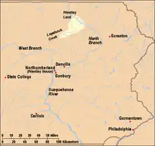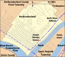 À la suite de la guerre de Sept Ans (1756-63) et deu début de la déportation des tribus indiennes d'Amérique vers l'ouest, Allemands, Écossais, Irlandais, et autres immigrants européens s'installent au centre de la vallée du fleuve Susquehanna, y compris dans la région qui va devenir la localité de Northumberland, en Pennsylvanie[1],[2]. Northumberland s'est construite autour d'une zone verte en 1772, sur un terrain acheté à l'origine aux Iroquois par la province de Pennsylvanie en 1768, dans le cadre du premier traité de Fort Stanwix. Pendant la révolution américaine, le village est évacué lors de la Big Runaway de 1778, et n'est pas recolonisé avant 1784[3]. En 1794, lorsque les Priestley s'y installent, il comprend quelques lieux de culte quaker et méthodiste, une brasserie, deux poteries, un fabricant de potasse, un horloger, une imprimerie (qui publie un hebdomadaire), plusieurs magasins, et environ une centaine de maisons[4].