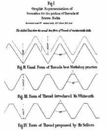 En 1841, Whitworth adopta une règle pour le taraudage avec un pas de vis dépendant du diamètre et un angle de filetage uniforme de 55°. Il apparut bientôt comme le premier système standardisé national ; son adoption par les compagnies de chemin de fer, qui jusque-là utilisaient toutes sortes de boulons, entraînèrent son usage universel et même son adoption comme norme (norme BS 84:1956) : le British Standard Whitworth (BSW) .