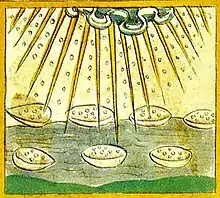 De même ce qui cause la pluie, est la même chose qui cause rhume et autres écoulements chez l'homme. La condensation des vapeurs mercurielles équivaut à la transformation de la pluie en neige, et à la survenue de paralysie ou d'apoplexie, et maladies semblables chez l'homme[20].