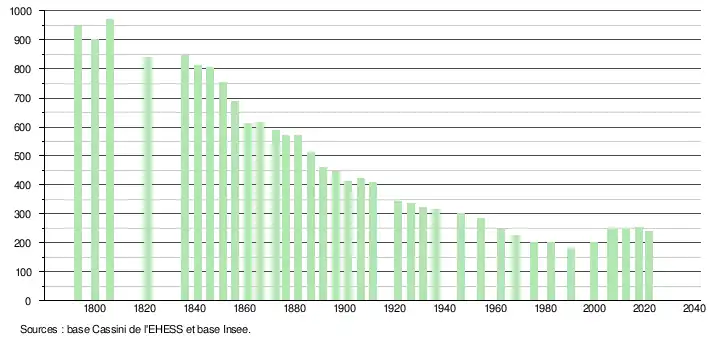 L'évolution du nombre d'habitants est connue à travers les recensements de la population effectués dans la commune depuis 1793. Pour les communes de moins de 10 000 habitants, une enquête de recensement portant sur toute la population est réalisée tous les cinq ans, les populations légales des années intermédiaires étant quant à elles estimées par interpolation ou extrapolation[22]. Pour la commune, le premier recensement exhaustif entrant dans le cadre du nouveau dispositif a été réalisé en 2007[23].