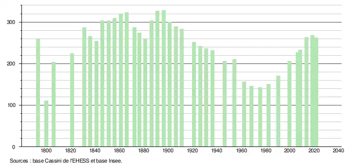 L'évolution du nombre d'habitants est connue à travers les recensements de la population effectués dans la commune depuis 1793. Pour les communes de moins de 10 000 habitants, une enquête de recensement portant sur toute la population est réalisée tous les cinq ans, les populations légales des années intermédiaires étant quant à elles estimées par interpolation ou extrapolation[15]. Pour la commune, le premier recensement exhaustif entrant dans le cadre du nouveau dispositif a été réalisé en 2008[16].