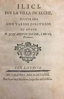 - Ilici, hoi la villa de Elche, ilustrada con varios discursos, version en ligne de l’ouvrage de Juan Antonio Mayans.