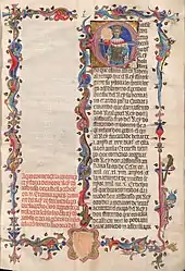 Blason de Juan Fernández de Heredia (ca. 1385-1396) dans l'incipit d'un manuscrit de son scriptorium, la Crónica de conquiridores[52]