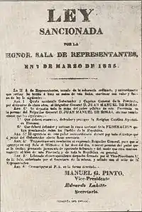 Le , c’est-à-dire un an jour pour jour après le coup de force de Lavalle, la Chambre des représentants (Legislatura) de la province de Buenos Aires se réunit à nouveau et proclama quelques jours plus tard Juan Manuel de Rosas gouverneur provincial, l’honorant en outre du titre de Restaurateur des lois et des institutions de la province de Buenos Aires[45], et lui accordant, dans le même acte législatif, « toutes facultés ordinaires et extraordinaires qu’il jugera nécessaires, jusques et y compris la convocation d’une nouvelle législature »[46]. Cet acte n’avait cependant rien d’exceptionnel : depuis le Premier triumvirat, les « facultés extraordinaires » avaient déjà été conférées auparavant à Manuel de Sarratea et à Martín Rodríguez en 1820, ainsi qu’aux gouverneurs de nombre d’autres provinces argentines au cours des années précédentes ; son prédécesseur Juan José Viamonte aussi les avaient détenues[47].
