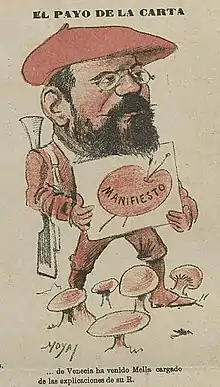La position de Mella au sein du carlisme demeurait précaire. En tant que personnalité reconnue au niveau national — en 1906 il fut invité à l'Académie royale de la langue[115] —, il était un atout que le parti ne pouvait se permettre d'ignorer, même si le prétendant restait méfiant et que le nouveau chef du parti, Matías Barrio y Mier, était déterminé à imposer une loyauté sans réserve. Mella développa une aversion particulière à son égard, allant jusq'à l'insulter en privé[116]. Outre leur inimitié personnelle respective, les deux hommes s'affrontèrent en termes de stratégie politique, puisque Mella fut le premier à développer ce qui devint plus tard la marque de fabrique du mellisme : un penchant pour la recherche de coalitions maximalistes d’extrême droite[117]. Après la mort de Barrio au début de 1909, Mella fit campagne pour que Cerralbo soit rétabli à la tête du mouvement et fut furieux de voir Bartolomé Feliú nommé à la place[118] ; certains le considéraient aussi comme un candidat possible[119].