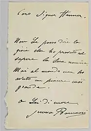 - « Mon cher ami, Je te remercie de ce que tu veux bien faire pour mes recommandés et puisque tu as la gentillesse de te charger d’appuyer nos amies, voici encore le nom que je te recommande chaudement et spécialement : Juana Carlesimo (notre Juana Romani). Je te serais reconnaissant de faire tout ton possible pour la faire accepter et avec un bon numéro si c’est possible. Recommande-la à Lefebvre et tous les membres que tu pourras car je ne peux assister aux premières séances de sélection. En cas d’échec, Tâche, je te prie, à la révision de faire reprendre son portrait Gitane – n°2177 – Je compte sur toi et te serre affectueusement la main. Carolus-Duran »