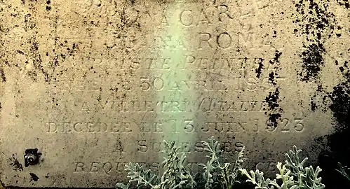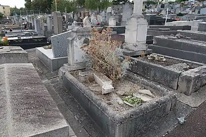 Sur sa pierre tombale, sont inscrites ses dates de naissance et de décès. Un portrait-médaillon, réalisé quelques années plus tôt par Victor Peter (1840-1918), orne sa tombe.