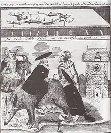 L’association des Juifs avec la truie et/ou le diable est aussi transmise par les images caricaturales qui circulent où on les voit avec des oreilles de cochon, des pieds de bouc et des cornes. Un pamphlet anti-juifs de 1571 montre la figure des Juifs recouverte d’une capuche jaune, avec le corps repoussant, des griffes comme les griffes du diable, des pattes d’oie, le visage d’un cochon avec des cornes et des bois. L’un d’entre eux, un jongleur avec une cornemuse, est à cheval sur une truie qui mange ses excréments[8].