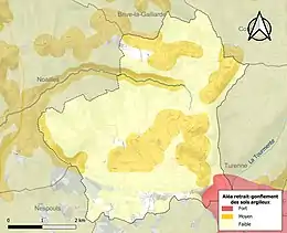 Le retrait-gonflement des sols argileux est susceptible d'engendrer des dommages importants aux bâtiments en cas d’alternance de périodes de sécheresse et de pluie. 34,8 % de la superficie communale est en aléa moyen ou fort (26,8 % au niveau départemental et 48,5 % au niveau national). Sur les 447 bâtiments dénombrés sur la commune en 2019, 194 sont en aléa moyen ou fort, soit 43 %, à comparer aux 36 % au niveau départemental et 54 % au niveau national. Une cartographie de l'exposition du territoire national au retrait gonflement des sols argileux est disponible sur le site du BRGM[18],[Carte 2].