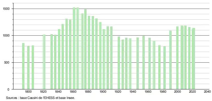 L'évolution du nombre d'habitants est connue à travers les recensements de la population effectués dans la commune depuis 1793. Pour les communes de moins de 10 000 habitants, une enquête de recensement portant sur toute la population est réalisée tous les cinq ans, les populations légales des années intermédiaires étant quant à elles estimées par interpolation ou extrapolation[18]. Pour la commune, le premier recensement exhaustif entrant dans le cadre du nouveau dispositif a été réalisé en 2005[19].
