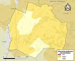 Le retrait-gonflement des sols argileux est susceptible d'engendrer des dommages importants aux bâtiments en cas d’alternance de périodes de sécheresse et de pluie. 76,5 % de la superficie communale est en aléa moyen ou fort (67,4 % au niveau départemental et 48,5 % au niveau national). Sur les 119 bâtiments dénombrés sur la commune en 2019, 108 sont en aléa moyen ou fort, soit 91 %, à comparer aux 81 % au niveau départemental et 54 % au niveau national. Une cartographie de l'exposition du territoire national au retrait gonflement des sols argileux est disponible sur le site du BRGM[19],[Carte 3].
