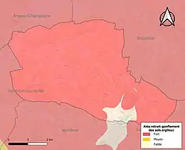 Le retrait-gonflement des sols argileux est susceptible d'engendrer des dommages importants aux bâtiments en cas d’alternance de périodes de sécheresse et de pluie. 96,1 % de la superficie communale est en aléa moyen ou fort (67,4 % au niveau départemental et 48,5 % au niveau national). Sur les 349 bâtiments dénombrés sur la commune en 2019, 349 sont en aléa moyen ou fort, soit 100 %, à comparer aux 81 % au niveau départemental et 54 % au niveau national. Une cartographie de l'exposition du territoire national au retrait gonflement des sols argileux est disponible sur le site du BRGM[19],[Carte 3].