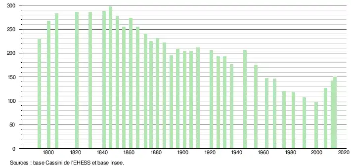 L'évolution du nombre d'habitants est connue à travers les recensements de la population effectués dans la commune depuis 1793. À partir du , les populations légales des communes sont publiées annuellement dans le cadre d'un recensement qui repose désormais sur une collecte d'information annuelle, concernant successivement tous les territoires communaux au cours d'une période de cinq ans. Pour les communes de moins de 10 000 habitants, une enquête de recensement portant sur toute la population est réalisée tous les cinq ans, les populations légales des années intermédiaires étant quant à elles estimées par interpolation ou extrapolation[15]. Pour la commune, le premier recensement exhaustif entrant dans le cadre du nouveau dispositif a été réalisé en 2006[16],[Note 2].