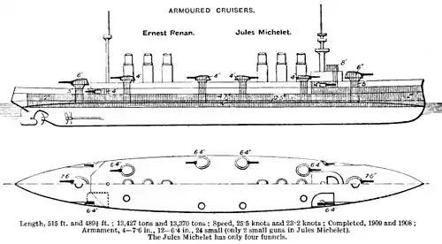 Le Jules Michelet est un croiseur cuirassé de la marine française qui est similaire au Léon Gambetta. Il reçoit un blindage en acier type Krupp : 150 mm pour la ceinture et 205 mm pour la passerelle.