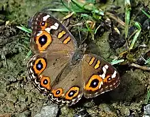 Junonia villida, d'une couleur marron terne est orné aux antérieures de deux taches orange et d'une marque blanche et il est caractérisé par deux ocelles prémarginaux orange centrés d'un point bleu entouré de noir.