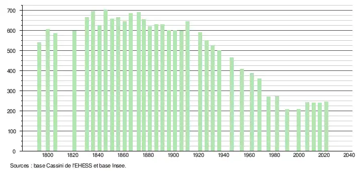 L'évolution du nombre d'habitants est connue à travers les recensements de la population effectués dans la commune depuis 1793. Pour les communes de moins de 10 000 habitants, une enquête de recensement portant sur toute la population est réalisée tous les cinq ans, les populations légales des années intermédiaires étant quant à elles estimées par interpolation ou extrapolation[14]. Pour la commune, le premier recensement exhaustif entrant dans le cadre du nouveau dispositif a été réalisé en 2006[15].