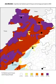 Le Jura bernois regroupe toutes les communes bernoises dont la population est majoritairement francophone, mais aussi trois petites communes dans lesquelles plus de 70% des habitants parlent allemand (Seehof/Elay, Schelten/La Scheulte et Mont-Tramelan) et une, Rebévelier, dans laquelle c’est le cas pour deux-tiers de la population. La présence de germanophones se vérifie également dans d’autres communes, par exemple à Romont ou Prêles avec 30 à 40% de personnes parlant allemand.