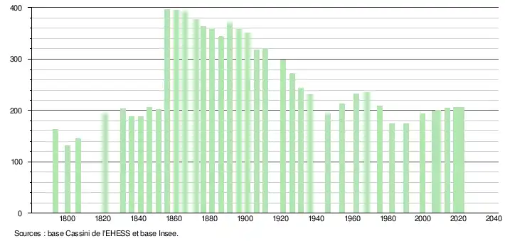 L'évolution du nombre d'habitants est connue à travers les recensements de la population effectués dans la commune depuis 1793. Pour les communes de moins de 10 000 habitants, une enquête de recensement portant sur toute la population est réalisée tous les cinq ans, les populations légales des années intermédiaires étant quant à elles estimées par interpolation ou extrapolation[21]. Pour la commune, le premier recensement exhaustif entrant dans le cadre du nouveau dispositif a été réalisé en 2008[22].