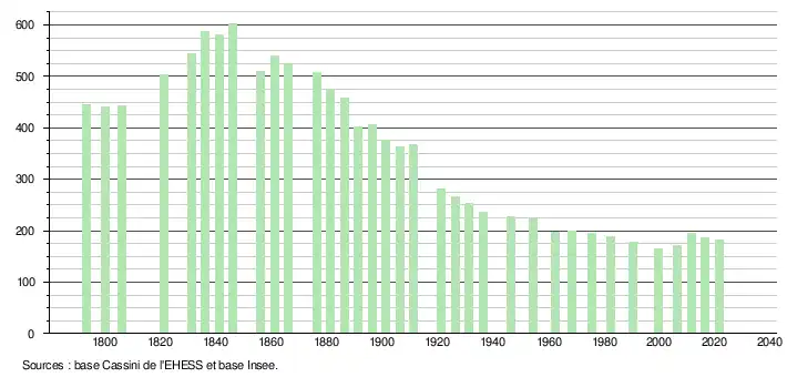 L'évolution du nombre d'habitants est connue à travers les recensements de la population effectués dans la commune depuis 1793. Pour les communes de moins de 10 000 habitants, une enquête de recensement portant sur toute la population est réalisée tous les cinq ans, les populations légales des années intermédiaires étant quant à elles estimées par interpolation ou extrapolation[18]. Pour la commune, le premier recensement exhaustif entrant dans le cadre du nouveau dispositif a été réalisé en 2006[19].