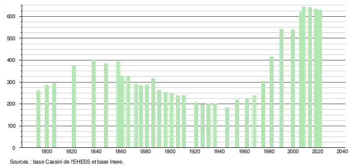 L'évolution du nombre d'habitants est connue à travers les recensements de la population effectués dans la commune depuis 1793. Pour les communes de moins de 10 000 habitants, une enquête de recensement portant sur toute la population est réalisée tous les cinq ans, les populations légales des années intermédiaires étant quant à elles estimées par interpolation ou extrapolation[17]. Pour la commune, le premier recensement exhaustif entrant dans le cadre du nouveau dispositif a été réalisé en 2008[18].