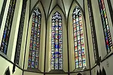 Le cycle des vitraux du chœur, réalisé entre 1325 et 1360, a été conservé dans sa plus grande partie ; il compte parmi les plus importantes des œuvres d'art européennes du XIVe siècle[12]. La plupart des hautes fenêtres gothiques montrent des scènes en cinq parties, chacune consacrée à un thème. Sur le côté sud, toutes les fenêtres n'ont pas été conservées. Dans l'abside est représentée la Passion du Christ, flanquée par des vitraux consacrés à l'Incarnation et à la Résurrection du Christ. La paire de vitraux suivante montre le précurseur, Jean-Baptiste (accompagné de sainte Catherine), et le successeur, l'Apôtre Paul (accompagné de Marie). La troisième paire de vitraux est consacrée aux apôtres. Les deux paires de vitraux suivantes sont dédiées à des saints avec lesquels l'Ordre ou la famille fondatrice avait une relation particulière : saint François, saint Nicolas, sainte Anne et sainte Claire[13].