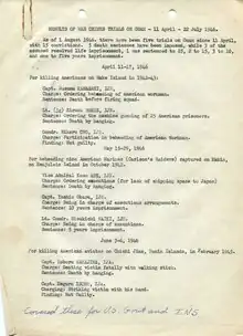 L'amiral Kōsō Abe (au centre) durant le procès de Guam pour crimes de guerre en 1946. | ||