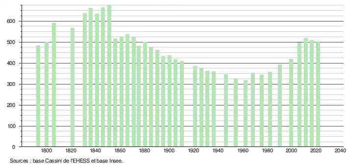 L'évolution du nombre d'habitants est connue à travers les recensements de la population effectués dans la commune depuis 1793. Pour les communes de moins de 10 000 habitants, une enquête de recensement portant sur toute la population est réalisée tous les cinq ans, les populations légales des années intermédiaires étant quant à elles estimées par interpolation ou extrapolation[18]. Pour la commune, le premier recensement exhaustif entrant dans le cadre du nouveau dispositif a été réalisé en 2006[19].
