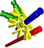 - Connexion pince-bout (jaune-vert sur l'image) qui permet 1 degré de liberté (rotation) avec une grande friction. Pour construire de grandes structures, les triangles isocèles sont très utilisés et sont réalisés avec ces connexions, très solides.