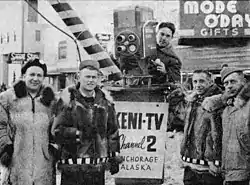 Le personnel de KENI-TV et les responsables championnat du monde de courses de chiens de traîneau de 1958 au centre-ville d'Anchorage.