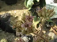 Une grande hampe florale axillaire (jusqu'à 60 cm de haut) porte une inflorescence paniculiforme, ramifiée en cymes[6], groupant des fleurs érigées, velues. Le calice vert jaunâtre, est couvert de longs poils laineux, à 4 lobes triangulaires. La corolle tubulleuse, laineuse, s'ouvre en 4 lobes (pétales) blancs à jaunes, striés de rouge foncé à l'intérieur. Les 8 étamines sont fixées en deux verticilles distincts sur le tube corollien. Les 4 carpelles sont connivents.