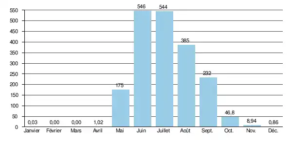En considérant la seule période estivale, libre de glaces (de juin à septembre inclus), le débit mensuel minimal observé a été de 78,4 m3/s en , niveau restant encore très satisfaisant. Un débit mensuel estival inférieur à 75 m3/s est exceptionnel.