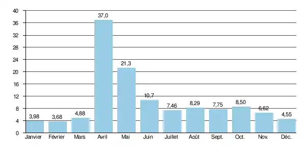 En ce qui concerne la période libre de glaces (de mai à octobre inclus), le débit mensuel minimum observé a été de 3,78 m3/s en , ce qui restait satisfaisant comparé au débit moyen.