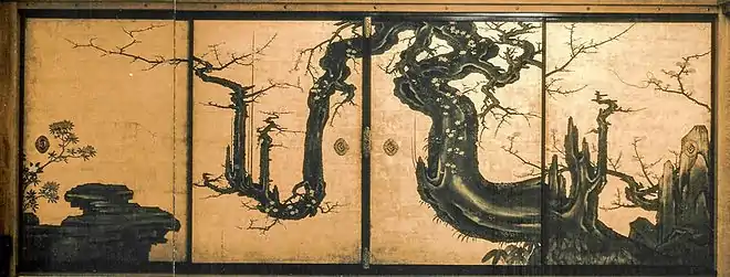 Le gros tronc noir d'un vieux prunier[2] of Art à branches courbées et tordues s'étend sur près de cinq mètres sur quatre panneaux coulissants. Le vieil arbre reptilien arbore des fleurs, qui transmettent l'atmosphère d'un matin de printemps encore froid et symbolisent la naissance et le renouvellement. Ces panneaux formaient à l'origine un mur d'une pièce dans le Tenshōin, un sous-temple du Myōshin-ji, un temple Zen à Kyoto. Pendant les années 1880, ces panneaux ont été vendus à un collecteur privé et taillés au sommet pour se conformer aux dimensions plus petites de sa maison. Au revers de ces panneaux se trouvait une composition représentant le thème chinois des huit immortels taoïstes, qui formaient le mur de la pièce adjacente.