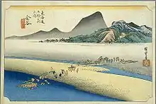 La classique estampe ukiyoe d'Ando Hiroshige (édition Hoeido), datant de 1831-1834, dépeint une procession de daimyos astreints au sankin kotai, traversant le fleuve. Le daimyo est dans un kago, tenu à flot par une plateforme improvisée portée par de nombreux serviteurs qui pataugent dans l'eau. À l'arrière-plan, un petit village se tient au pied de la colline.