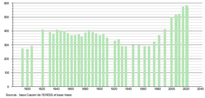 L'évolution du nombre d'habitants est connue à travers les recensements de la population effectués dans la commune depuis 1793. Pour les communes de moins de 10 000 habitants, une enquête de recensement portant sur toute la population est réalisée tous les cinq ans, les populations légales des années intermédiaires étant quant à elles estimées par interpolation ou extrapolation[16]. Pour la commune, le premier recensement exhaustif entrant dans le cadre du nouveau dispositif a été réalisé en 2005[17].
