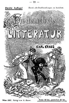 En 1896 paraît, dans la Wiener Rundschau, le premier texte important de Karl Kraus : La Littérature démolie, dans lequel il s’en prend à l’avant-garde littéraire viennoise dite de la « Jeune Vienne » (Hermann Bahr, Arthur Schnitzler et Hugo von Hofmannsthal sont les plus connus des écrivains qui y sont pris à partie) et à ce qu’il appelle « tous les outils de la littérature : l’absence de talent, la sagesse précoce, les poses, la mégalomanie, les grisettes des faubourgs, les cravates, le maniérisme, les faux datifs, les monocles et les nerfs secrets[19].»