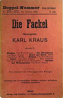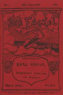 Ce cahier rouge, dont la parution ne fait pas sensation seulement à Vienne, mais dans l’ensemble des nations qui composent l’Empire austro-hongrois[25], est le premier numéro de la revue que Karl Kraus, inspiré par la revue d’Henri Rochefort, La Lanterne, a baptisé Die Fackel (La Torche ou Le Flambeau), et dont chaque livraison (trois fois par mois au début) deviendrait « pour de très nombreux intellectuels, écrivains (Musil, Canetti, Broch), musiciens (Schönberg, Berg), philosophes (Wittgenstein, Benjamin, Adorno) un événement crucial de pensée[26]. » Durant près de quarante ans, Kraus « y pourfend[rait] sans relâche l’hypocrisie sociale, les dénis de justice, les complaisances douteuses, les silences coupables, les petites lâchetés et les grandes vanités qui tissent la vie publique et intellectuelle d’un pays », sans oublier de « dénoncer l’avilissement du style, la « culture journalistique » dans laquelle il voyait […] l’agent corrosif d’une désintégration de l’esprit, de sa faculté de jugement[27]. »