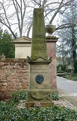 Ironie de l'histoire, les mausolées de Kotzebue et de son jeune assassin voisinent désormais au cimetière de Mannheim (de), situés respectivement aux emplacements no 83 et no 138; en réalité, les cendres du condamné, d'abord conservées dans le cimetière luthérien[49], y furent translatées en 1869[50], en préparation du cinquantième anniversaire de son décès. Le monument de Sand - pyramide tronquée (grès) et médaillon de bronze - serait du sculpteur allemand Kowan[51] et daterait de 1906. Au-dessus du médaillon, un célèbre vers du poète Théodore Körner, que Sand aimait tant : Alles Ird'sche ist vollendet, und das Himmlische geht auf[52]! (Bundeslied vor der Schlacht ().