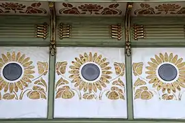Les pavillons de la station de métro Karlsplatz présentent une structure en fer forgé[6] peinte en couleur vert pomme, la couleur de la Stadtbahn[2],[6], qui porte des dalles de marbre blanc de Carrare[7] ornées de fleurs de tournesol de couleur noir et or et de cartouches dorés.