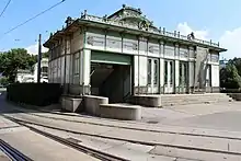 Otto Wagner (1841-1918) fut l'architecte en chef de la Wiener Stadtbahn, un métro urbain léger[2] en grande partie aérien. C'est en 1898 qu'il construisit, avec son élève Josef Maria Olbrich, deux pavillons identiques[2] pour la station de métro qui ouvrit en 1899 sous le nom d'Akademiestraße[3] et qui est maintenant connue sous le nom de Karlsplatz.