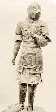 Un exemple célèbre est la statue de Karura (image à droite) au temple de Kōfukuji, à Nara (qui fait partie des huit statues de deva présentées lors du Buddhābhiṣeka (en) datant de l'ère Tenpyō 6 (734 apr. J.-C.)[4]. Ce karura est représenté vêtu d'une armure de style dynastie Tang, et est donc sans ailes.